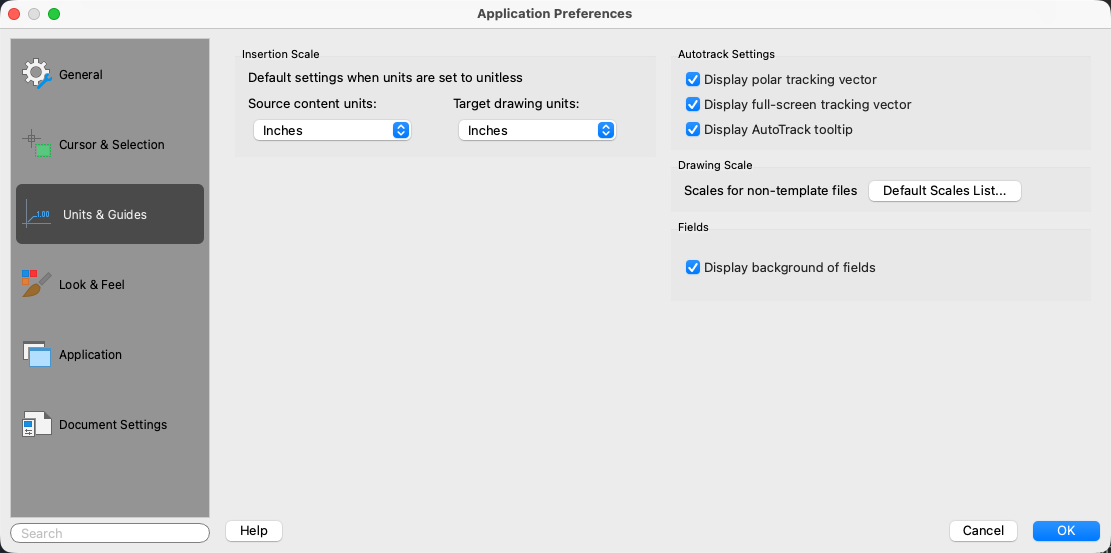 Controls the units used when inserting blocks or referencing objects, and which drafting guides are enabled.
