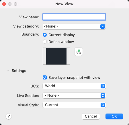 Saves a new, named view from what's displayed in the current viewport, or by defining a rectangular window.