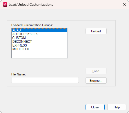 Specifies the file to load when you choose Load. You can either enter the file name or choose Browse to display the Select Customization File dialog box (a standard file selection dialog box).