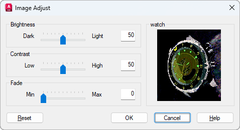 Controls the fading effect of the image. The greater the value, the more the image blends with the current background color. A value of 100 blends the image completely into the background. Changing the screen background color causes the image to fade to the new color. In plotting, the background color for fade is white.