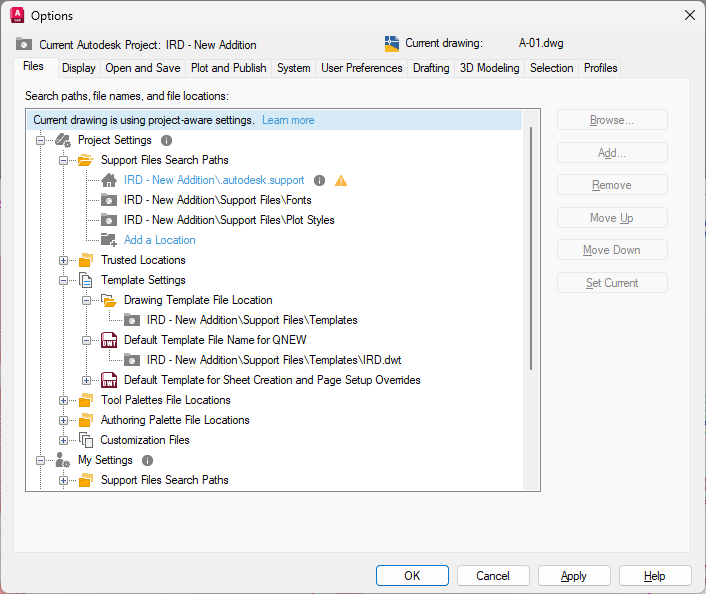 Forma Data Management has been set up to use Connected Support Files, you can set or change the paths of these settings. Paths are searched in the order that they are listed. If the same file is found in multiple folders, then the first instance found is used. Settings under Project Settings take precedence over My Settings and then Classic AutoCAD Settings.