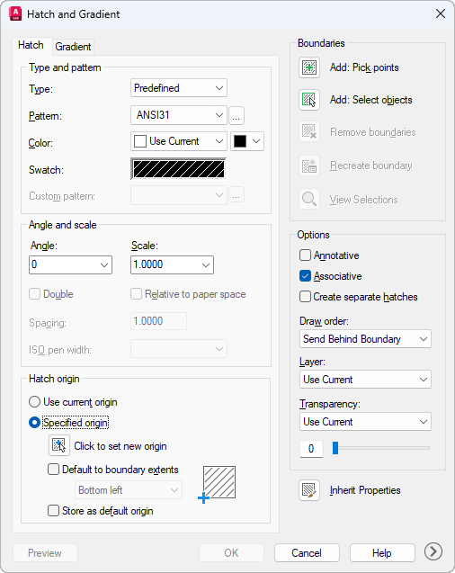 The Hatch and Gradient dialog box has two tabs and some common options that are available from both tabs.