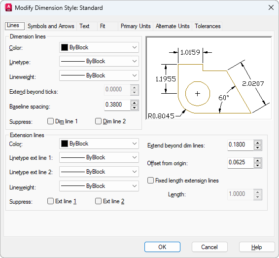 Sets the format and properties for dimension lines, extension lines, arrowheads, and center marks.
