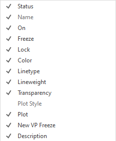Lists all columns by name. A check mark indicates that the column is included in the display. Click a column name to display or hide the column. VP Freeze, VP Color, VP Linetype, VP Lineweight, and VP Plot Style are available only when a layout viewport is active.