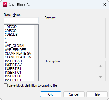 Saves the block definition as a drawing file. Selecting a pre-existing drawing file overwrites the saved file. By default, the block name specified is taken as the drawing file name.