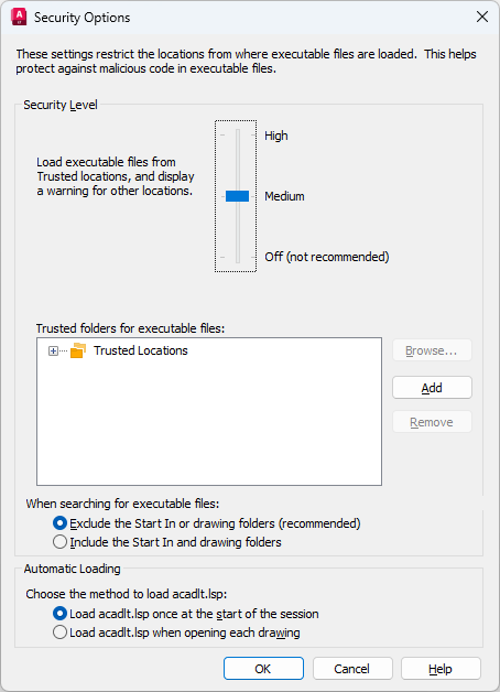 Loads executable files from trusted locations only. Executable files in all other locations are ignored. (SECURELOAD system variable = 2)