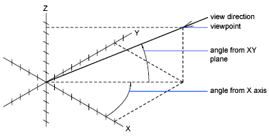 You can rotate a view using -VPOINT. The following illustration shows a view defined by two angles relative to the X axis and the XY plane of the WCS.