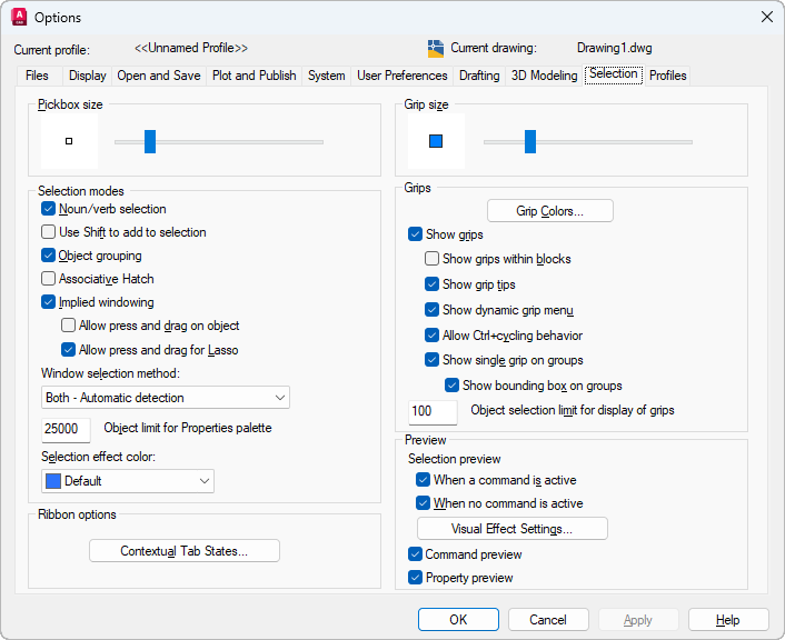 Controls whether you can preview the outcome of the active command. (COMMANDPREVIEW system variable)