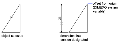 If you select a line or an arc, the line or arc endpoints are used as the origins of the extension lines. The extension lines are offset from the endpoints by the distance you specify in Offset from Origin in the Lines and Arrows tab of the New, Modify, and Override Dimension Style dialog boxes. See DIMSTYLE. This value is stored in the DIMEXO system variable.