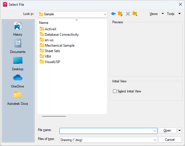 Displays the Partial Open dialog box. You can open and load a portion of a drawing, including geometry on a specific view or layer. The PARTIALOPEN command can be used only for drawings in AutoCAD 2004 or later format.