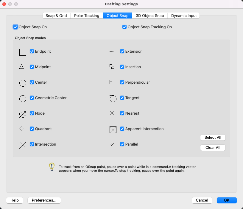 Turns on all object snap modes.
