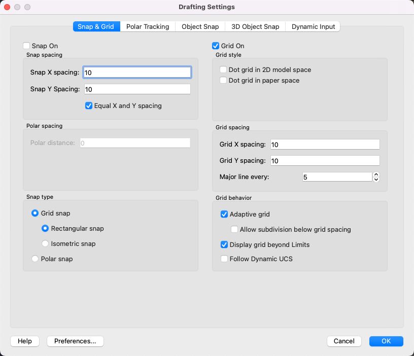 Sets the snap increment distance when PolarSnap is selected under Snap Type & Style. If this value is 0, the PolarSnap distance assumes the value for Snap X Spacing. The Polar Distance setting is used in conjunction with polar tracking and/or object snap tracking. If neither tracking feature is enabled, the Polar Distance setting has no effect. (POLARDIST system variable)