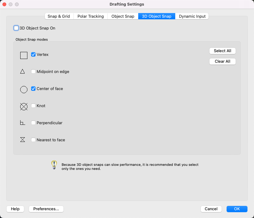 Turns off all 3D object snap modes.