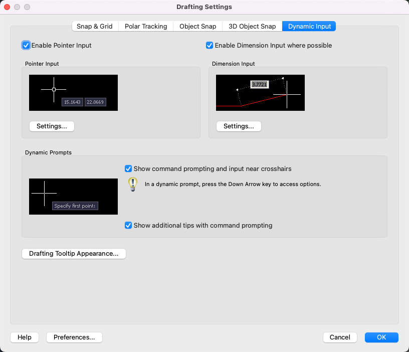 Controls pointer input, dimension input, dynamic prompting, and the appearance of drafting tooltips.