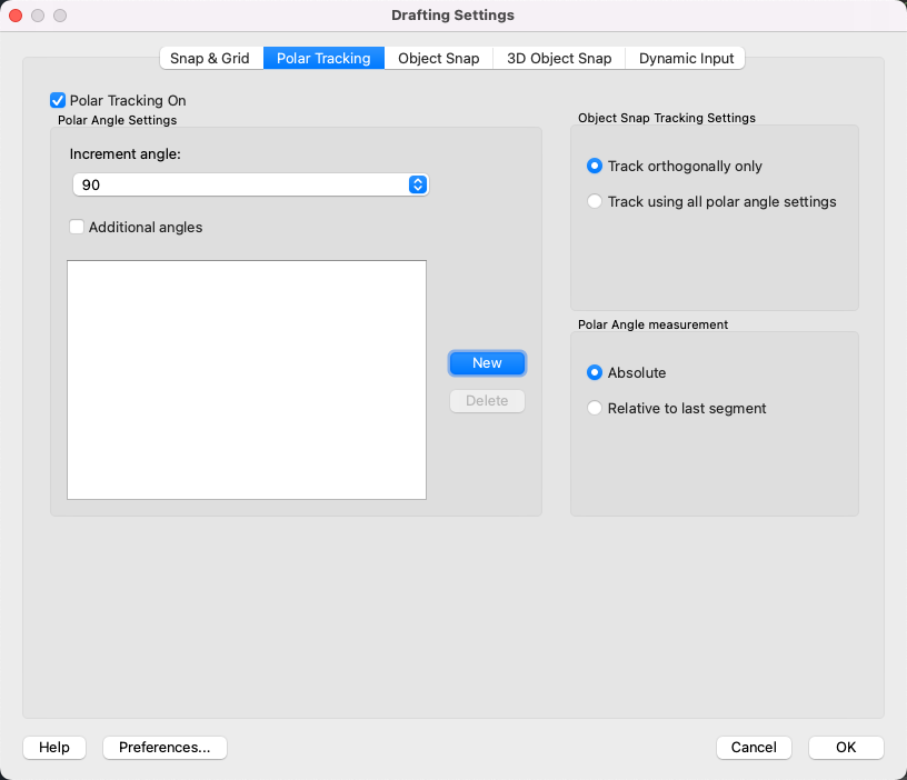 If Additional Angles is selected, lists the additional angles that are available. To add new angles, click New. To remove existing angles, click Delete. (POLARADDANG system variable)