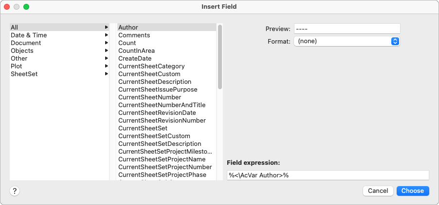 Options for Sheet Set and Sheet View Fields