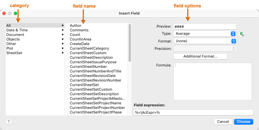 In the Insert Field dialog box, select a category and a field name.
