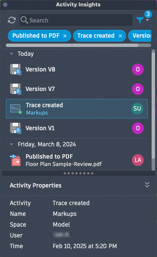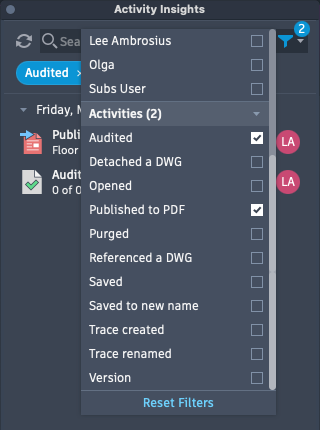 The Activity Insights palette opens, displaying activities for the current drawing.