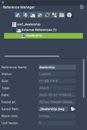 The Reference Manager palette contains a toolbar along the top. You can right-click over the files list to display a shortcut menu that allows you to attach or manage an attached external reference. Click the Show Details button on the toolbar to view details and thumbnail preview for the selected external reference.