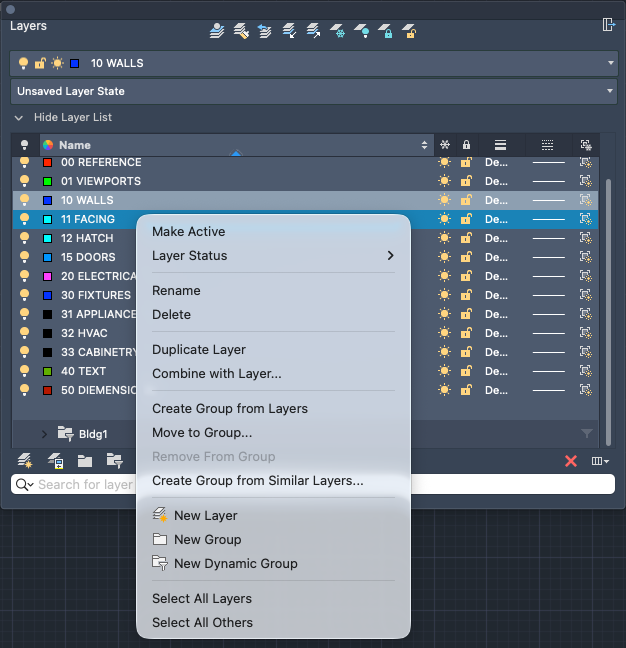 Sets the selected layer as the current layer. (See CLAYER system variable)