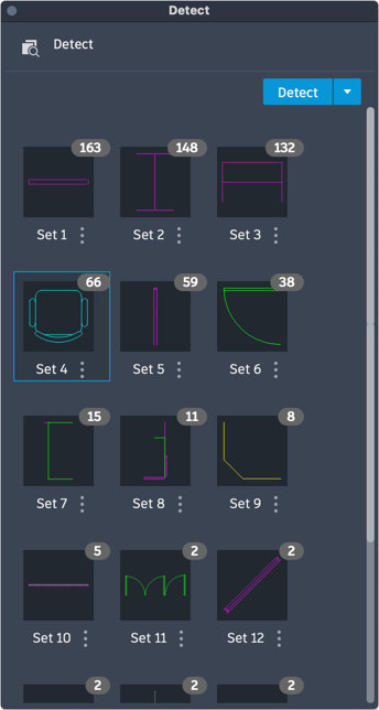 When you start Detect, Autodesk AI scans the drawing's geometry. Once drawing analysis is complete, the palette will notify you of sets of detected objects that can be converted to blocks. A