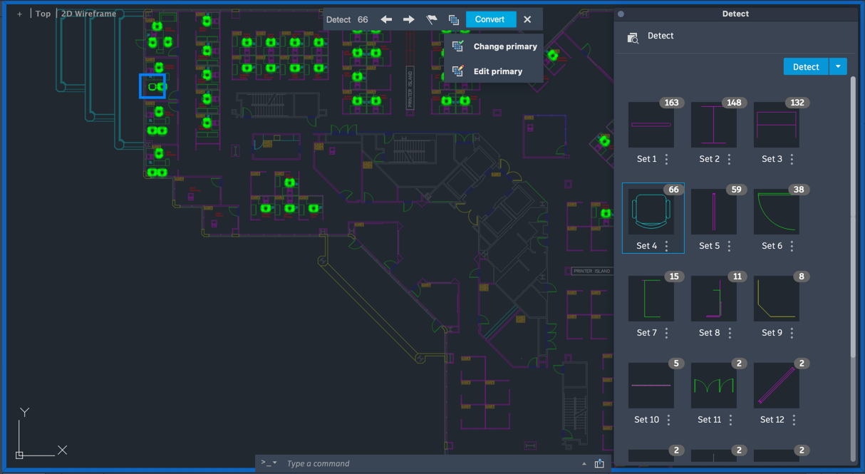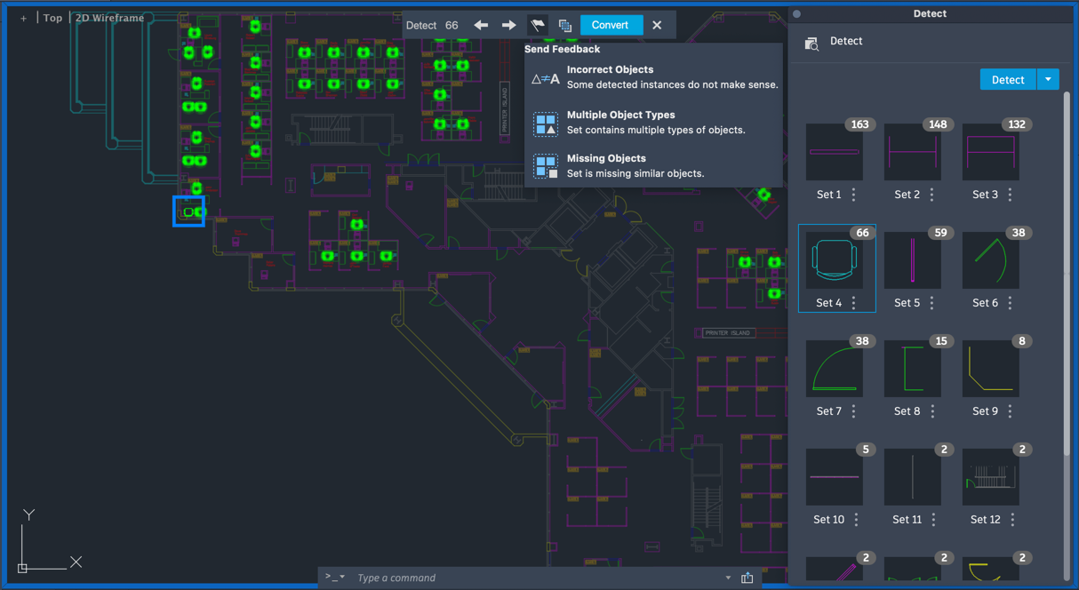 AutoCAD Detect and Convert uses Autodesk AI to scan your drawing and identify objects that can be converted into blocks.
