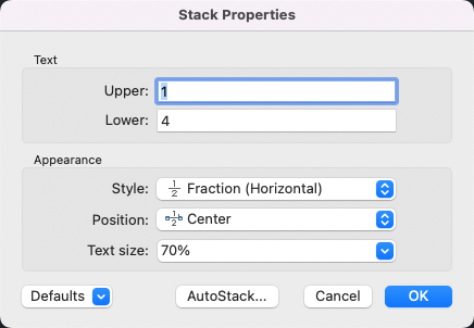 Displays the AutoStack Properties dialog box. AutoStack only stacks numeric characters immediately before and after the carat, slash, and pound characters. To stack nonnumeric characters, or text that includes spaces, select the text and choose Stack from the text editor shortcut menu.
