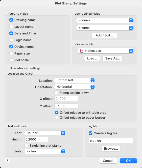 Determines the plot stamp location, the orientation of the plot stamp, and the offset you want to apply relative to either the printable area or the paper border.