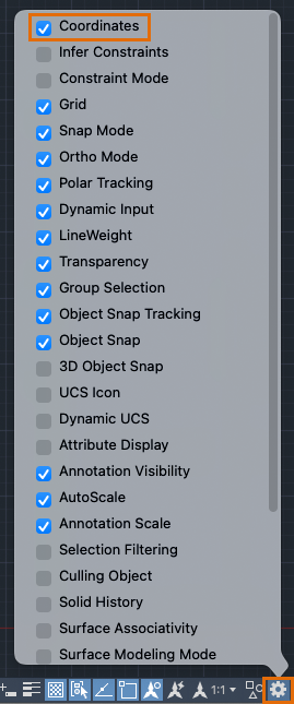 If coordinates are not displayed on the status bar, select Coordinates from the status bar settings.