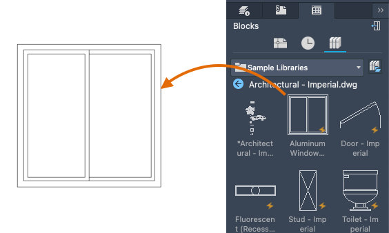 - From the Blocks palette, double-click to place the block, or drag to place it. When you double-click to place the block you can use object snaps for more precision.