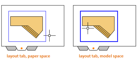 When you're working on a layout tab, you can switch between paper space and model space without returning to the Model tab. Here's how. As shown in the illustration, you move your cursor and double-click either inside a layout viewport to access model space or you double-click outside the layout viewport to return to paper space. When you're in model space, the border of the layout viewport becomes thicker.