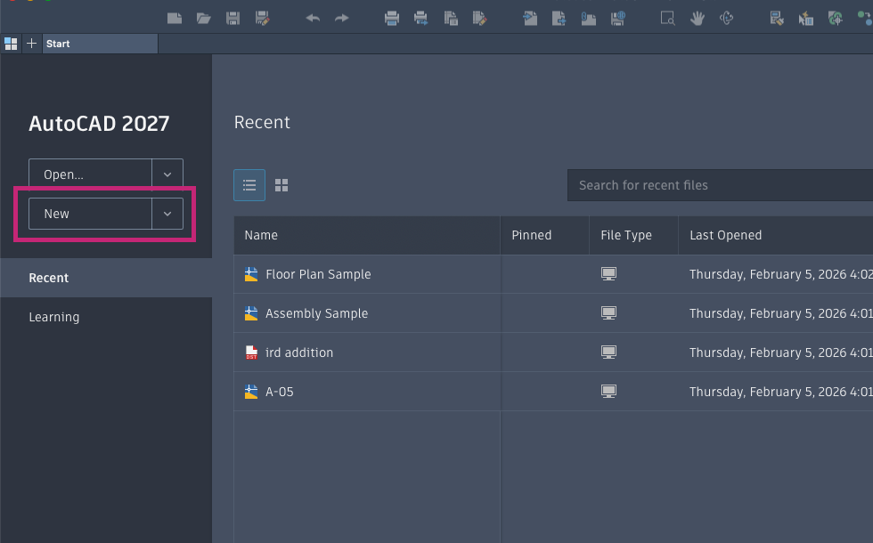 After you launch AutoCAD, on the Start tab, click New or click the New drop-down menu to begin a new drawing.
