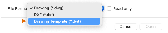 If you work independently, you can develop your drawing template files to suit your working preferences, adding settings for additional features as you become familiar with them. To modify an existing drawing template file, click Open, specify Drawing Template (*.dwt) in the dialog box, and choose the template file.