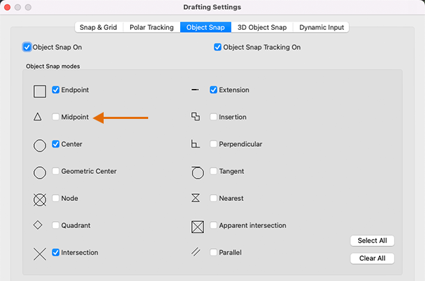 Object snap tracking | Tracks the cursor horizontally and vertically from object snap locations. |