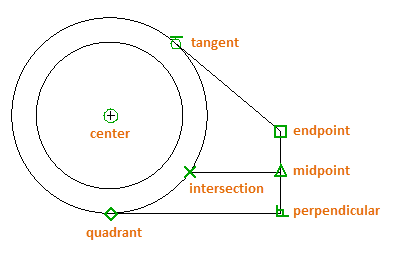 By far, the most important way for you to specify precise locations on objects is to use object snaps. In the following illustration, several different kinds of object snaps are represented by markers.