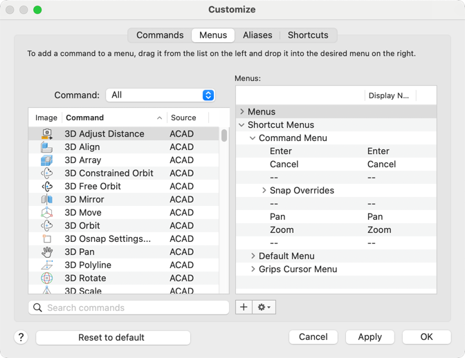 - Command Menu: Defines the menu that appears during the execution of certain commands. For example, you can add snap options when drawing a line.