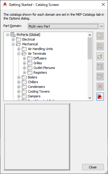 When selecting a part to create or modify, the Getting Started - Catalog Screen dialog box detects the part domain, and guides you by activated icons to ensure that you use the correct building environment. Icons are activated based on the selected domain and part in the part catalog browser, whether parametric or block-based. For example, if you select an MvPart part catalog, both the New Block Part and New Parametric Part icons are available. However, if you select a component part catalog such as duct or cable tray, only the New Parametric Part icon is available.