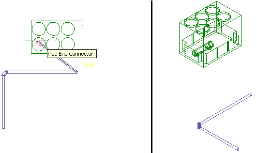 The following example describes how routing solutions work when connecting a pipeline to a chiller. The pipeline is on a different elevation, and the end of the pipeline is not in line with the chiller connection. You select the last pipe segment, and click