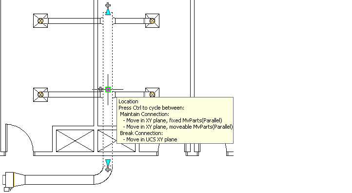 If the object is connected to a system, you can move connected objects in the current XY plane to maintain connectivity. The following illustrations show how location grips are used to move duct objects.