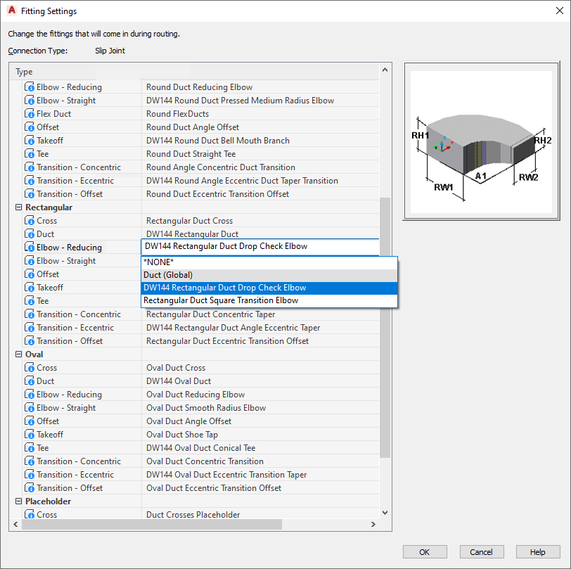 When you configure a routing preference for a particular specification, the appropriate fittings are automatically inserted into the duct layout.