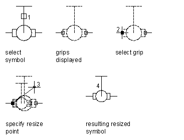 Schematic symbols can be converted to blocks, by using the BLOCK command, or by using Copy and then Paste as Block. When selected as blocks, they have a single grip at the insertion point that displays as an empty blue box. To scale the symbol, select the blue box at the insertion point as the base grip (base point), select Scale grip mode, and then move the cursor to resize the symbol.