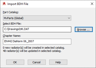 Radiator folder of the MvParts catalog under the specified folder name. AutoCAD MEP 2027 toolset organizes parts according to the subchapter names specified in the BDH file and also updates existing radiators.