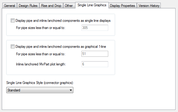 select Display pipe and inline/anchored components as graphical 1-line. For pipe sizes less than or equal to, enter an upper limit diameter. Then for Inline/anchored MvPart plot length, enter a plot length. |