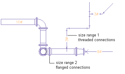 Multiple size ranges provide more flexibility in your piping designs. For example, assume a design specification for a chilled water system requires commercial steel pipe with threaded connections for all pipe sizes 3'' and lower. The system also specifies commercial steel pipe with 150 class, weld neck, flange connections for pipe sizes 3 1/2'' and higher.