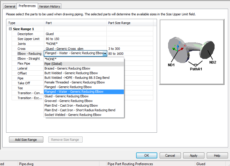 For example, when creating a routing preference, you select a pipe with sizes that range from 1/8” to 60” and an elbow with sizes that range from 1” to 24”. Because the lower limit of the size range is set to 1”, you can select an upper limit as high as 24”.