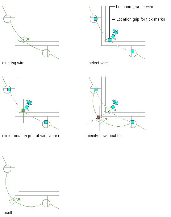 You can modify the layout of wires by moving their vertices using Location grips. This can be helpful when you want to clean up the layout by moving the wires around walls, equipment, or other floor plan geometry.