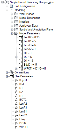 The model parameters of a parametric part define the default part size of the model and act as placeholders for the actual part sizes that you define later. In turn, the size parameters of the part define the actual part sizes. There is a direct connection between the model parameters and the size parameters. When you add a model parameter to the part model, the software adds a corresponding size parameter as well.