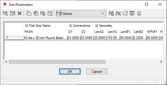 - Values. You use this mode to view and change the values of parameters when they are stored as lists, tables, and constants. You define multiple part sizes by entering multiple values for the size parameters. You can enter the values manually or copy and paste them from another part open in Content Builder, from a part open in Catalog Editor, or from a spreadsheet. For connector parameters, you can also insert the corresponding sizes for the segments used by default during layout.