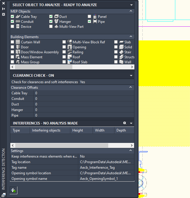 Note: The Interference Analysis mode works on a per drawing basis. If you switch to another drawing, the Interference Detection palette will be updated, based on the currently active drawing.