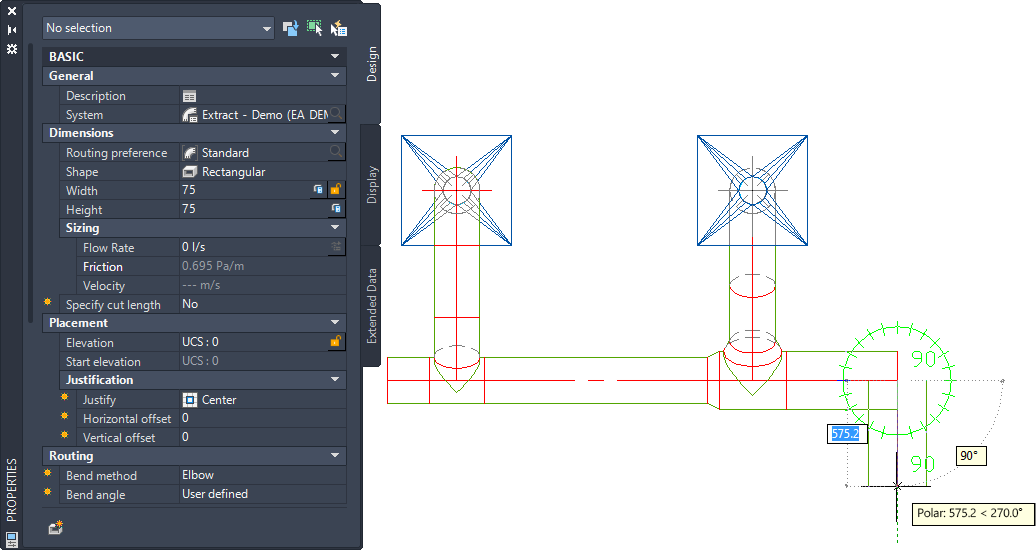 You can calculate duct sizes using either the equal friction method or the constant velocity method. To specify which duct sizing method to use, see Specifying Sizing Parameters for a Duct System. The instant sizing tool calculates capacity by adding the flow values for all outlets detected in the duct run. If no flow values have been assigned to outlet devices, the capacity displayed is zero.